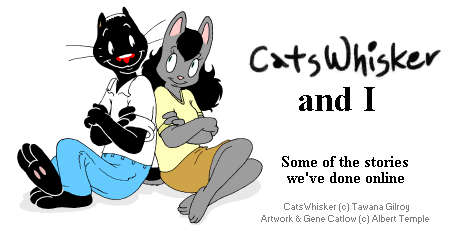 This is a directory I've created to hold some of the collaborative stories that CatsWhisker and I did on Yerf, VCL and Orlando. Sadly, my lady cat had to go offline (for what I hope will be a temporary period) because of problems with some distant members of her family. She has taken all her art offine as a result. But here, in this directory, you will be able to see some of the work we did together. :) You should be informed that a few people regard some of the stories we did as as naughty, so if you are easily offended, exercise caution in reading some of them. I, personally, love all these stories.. but hey, I love everything my lady cat and I did together. Trying to second-guess what's gonna offend or upset people is impossible, so I basically just give a simple warning and let it go at that.